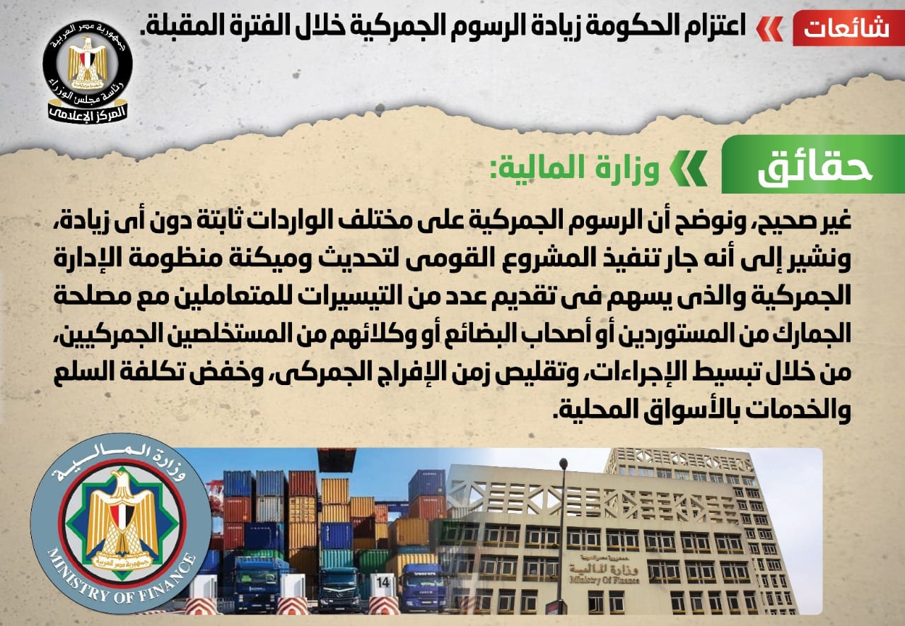 نفت وزارة المالية، الأنباء المتداولة في بعض المواقع الإلكترونية وصفحات التواصل الاجتماعي بشأن اعتزام الحكومة زيادة الرسوم الجمركية خلال الفترة المقبلة، حيث قام المركز الإعلامي لمجلس الوزراء بالتواصل مع المالية، والتي وضحت أن الرسوم الجمركية على مختلف الواردات ثابتة دون أي زيادة.
