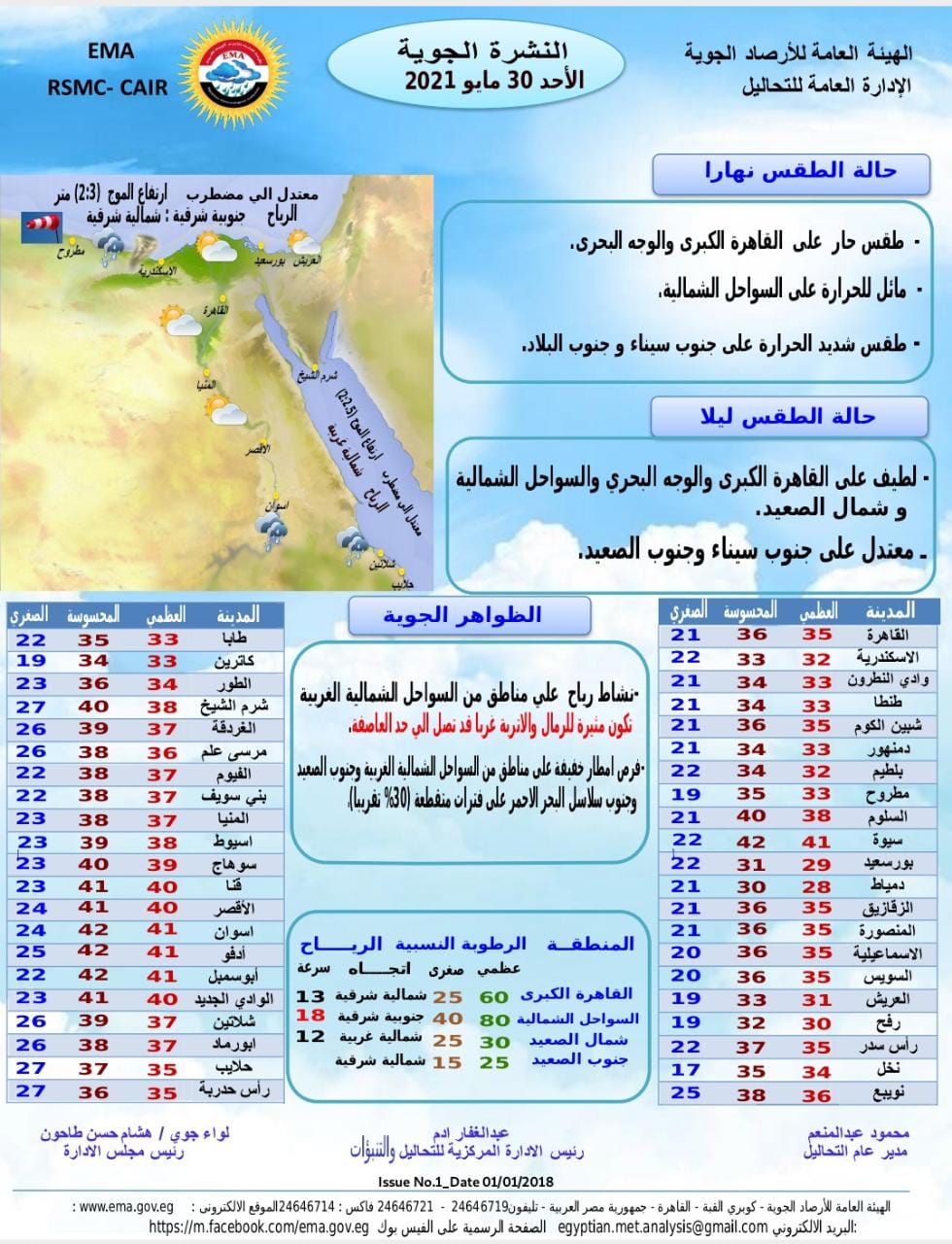 أعلنت الهيئة العامة للأرصاد الجوية، حالة الطقس اليوم الأحد 30 مايو 2021، وبيان درجات الحرارة على أنحاء الجمهورية، والتي يرصدها “القاهرة 24” للقراء والمتابعين، للتسهيل عن الباحثين عن حالة الطقس في مصر اليوم، وذلك من خلال التقرير التالي:-