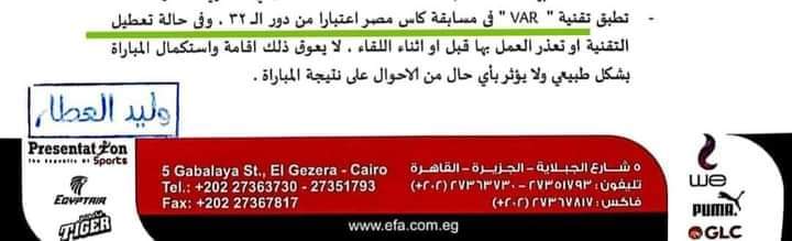 وتنص لائحة المسابقات على تطبيق تقنية الفار في مسابقة كأس مصر اعتبارا من دور الـ32، وفي حالة تعطيل التقنية أو تعذر العمل بها قبل أو أثناء المباريات، لا يعوق ذلك إقامة واستكمال المباراة بشكل طبيعي ولا يؤثر بأي حال من الأحوال على نتيجة المباراة.