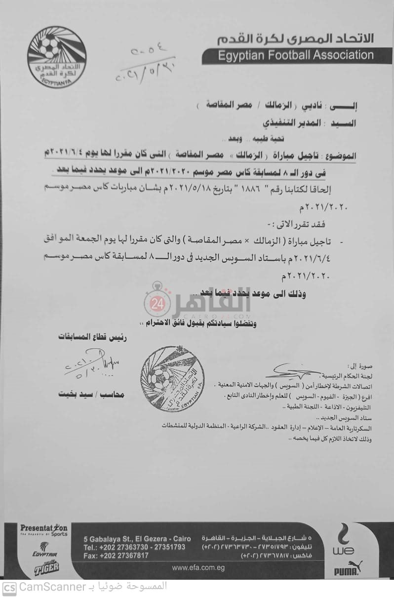 قررت لجنة المسابقات بالاتحاد المصري لكرة القدم، تأجيل مباراة الزمالك ومصر المقاصة يوم 4 يونيو المقبل في ربع نهائي بطولة كأس مصر.