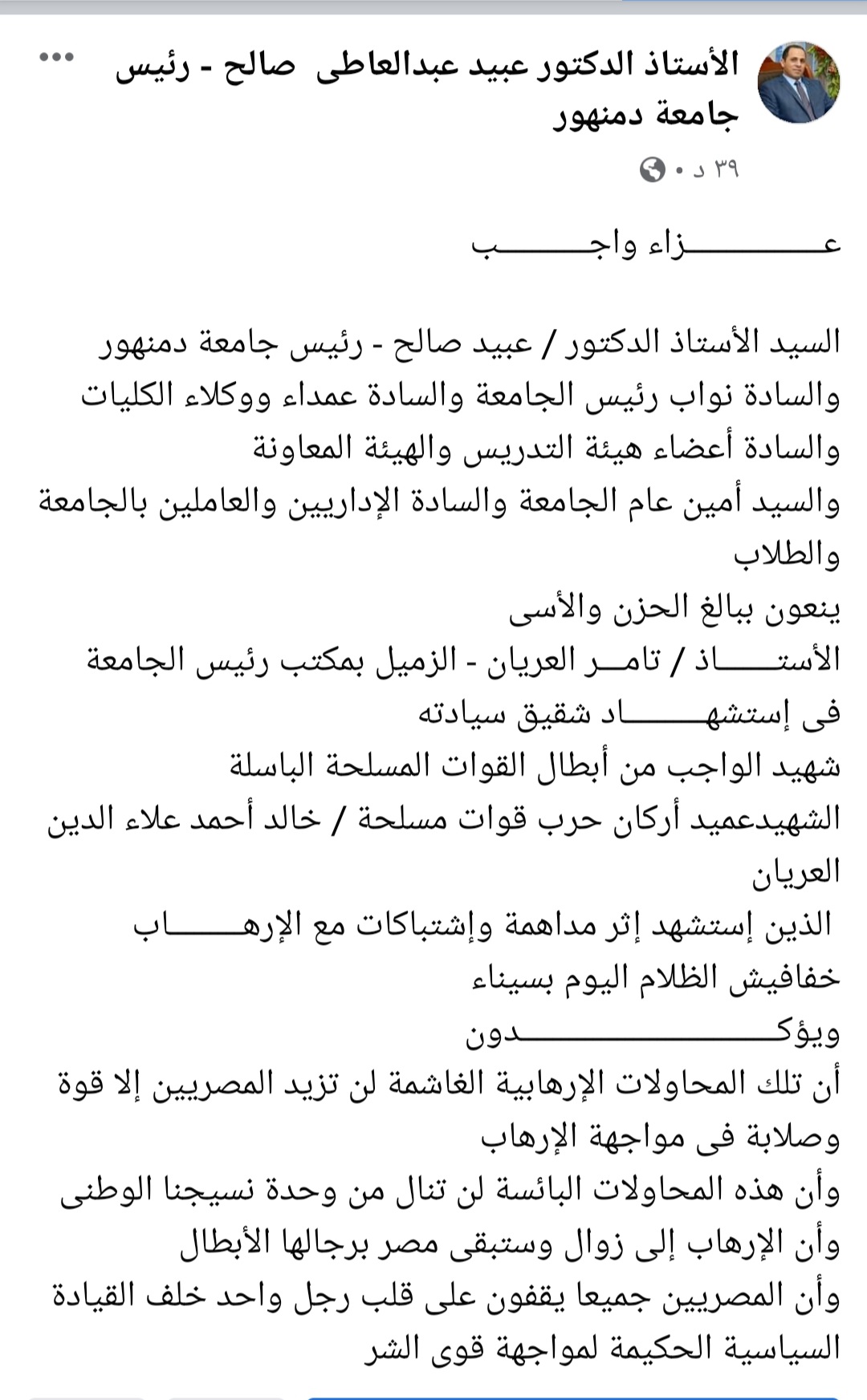 وتقدم الدكتور عبيد صالح، رئيس جامعة دمنهور، ونواب رئيس الجامعة وعمداء ووكلاء الكليات وأعضاء هيئة التدريس والهيئة المعاونة وأمين عام الجامعة والإداريين والعاملين بالجامعة والطلاب، ببالغ الحزن والأسى، العزاء في استشهاد شهيد الواجب من أبطال القوات المسلحة الباسلة الشهيد العقيد خالد أحمد علاء الدين العريان، الذي استشهد إثر مداهمة واشتباكات مع الجماعات الإرهابية اليوم بسيناء.