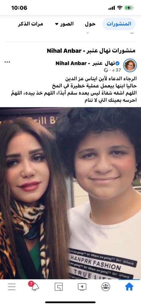 ونشرت نهال عنبر، صورة لابن إيناس عز الدين، عبر حسابها الشخصي بموقع التواصل الاجتماعي “فيس بوك”، وعلقت قائلة: "الرجاء الدعاء لابن إيناس عز الدين.. حاليًا ابنها بيعمل عملية خطيرة في المخ.. اللهم اشفه شفاءً ليس بعده سقم أبدًا، اللهم خذ بيده، اللهمّ أحرسه بعينك التي لا تنام".