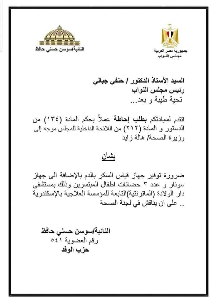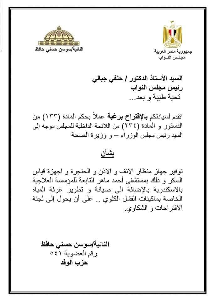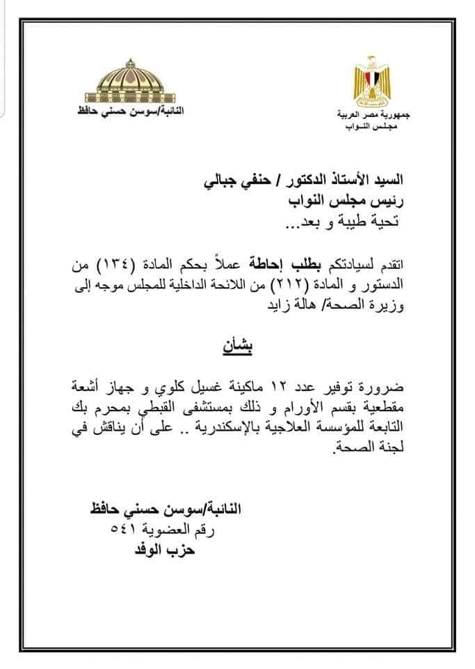 قدمت النائبة الوفدية سوسن حسني حافظ، عضو مجلس النواب عن محافظة الإسكندرية، بطلبَيْ إحاطة إلى رئيس مجلس النواب المستشار حنفي جبالي، ووزيرة الصحة الدكتورة هالة زايد، لتوريد أجهزة ومعدات إلى عدد من مستشفيات المحافظة.