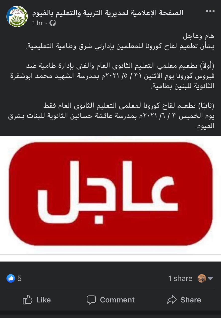 وتابعت، أن تطعيم لقاح كورونا لمعلمي التعليم الثانوي العام فقط سيكون يوم الخميس 3 يونيو المقبل بمدرسة عائشة حسانين الثانوية للبنات بشرق الفيوم.