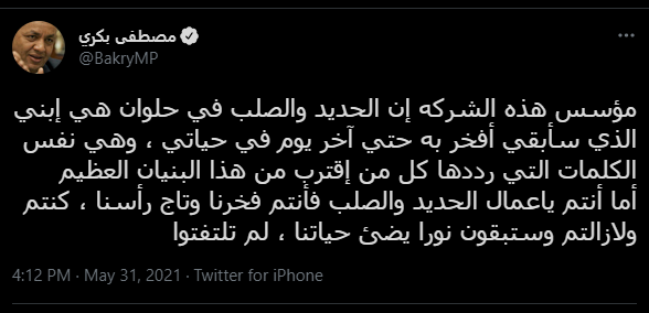 في سياق متصل، وصف بكري، مصنع الحديد والصلب بـ"الابن"، في تغريدة له على موقع التواصل الاجتماعي "تويتر"، قائلًا: "أما أنتم ياعمال الحديد والصلب فأنتم فخرنا وتاج رأسنا، كنتم ولا زلتم وستبقون نورًا يضيء حياتنا، لم تلتفتوا".