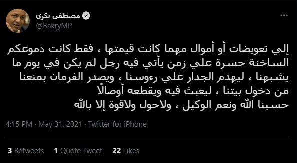 وأضاف، أن التعويضات سواء بأموال مهما كانت قِيمتها، فقط كانت دُموعكم الساخنة حسرة على زمن يأتي فيه رجل لم يكن في يوم ما يُشبهنا، ليهدم الجدار على رؤوسنا، ويُصدر الفرمان بمنعنا من دخول بيتنا، ليعبث فيه ويُقطّعه أوصالًا.. حسبنا الله ونعم الوكيل، ولا حول ولاقوة إلا بالله".
