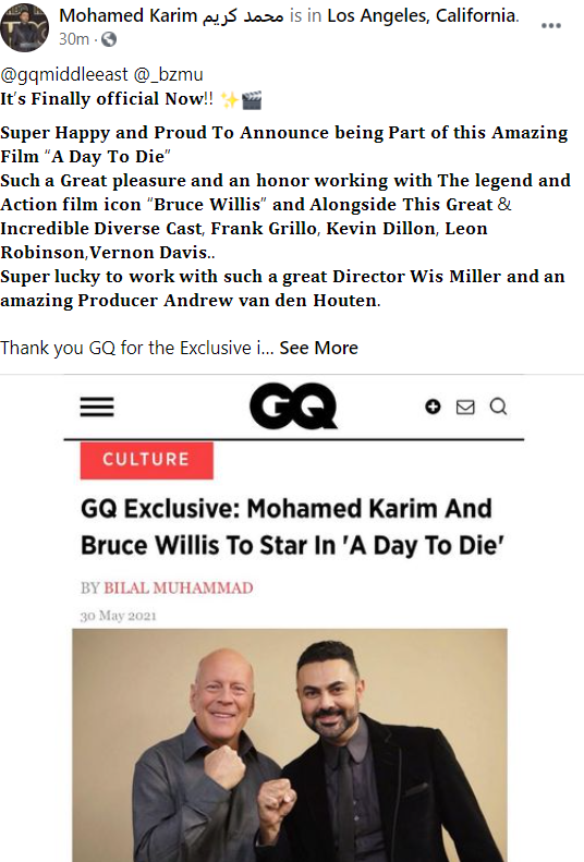 كشف موقع مجلة عالمية، مشاركة الفنان محمد كريم عن بطولة فيلم"A Day to Die" مع نجم الأكشن العالمي بروس ويليز، والعمل من إخراج المخرج الإمريكي ويز ميللر.