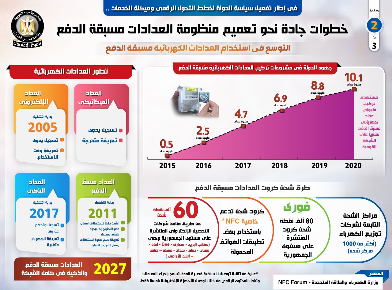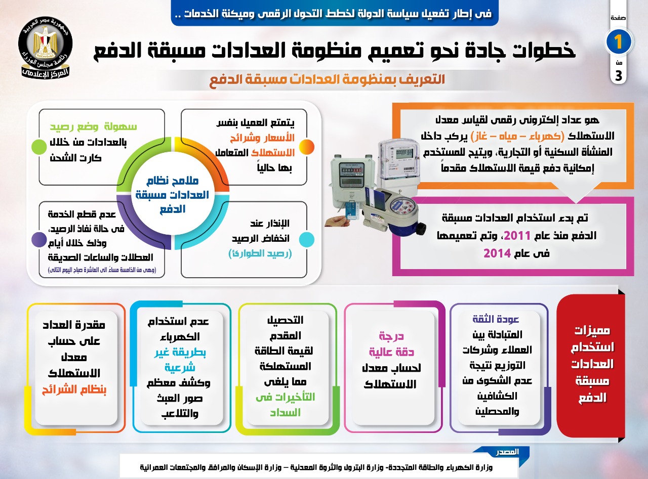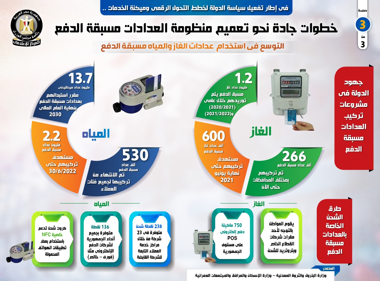 نشر المركز الإعلامي لمجلس الوزراء، تقريراً تضمن إنفوجرافات تسلط الضوء على الخطوات الجادة التي اتخذتها الدولة نحو تعميم منظومة العدادات مُسبقة الدفع، وذلك في إطار تفعيل سياستها لخطط التحول الرقمي وميكنة الخدمات.