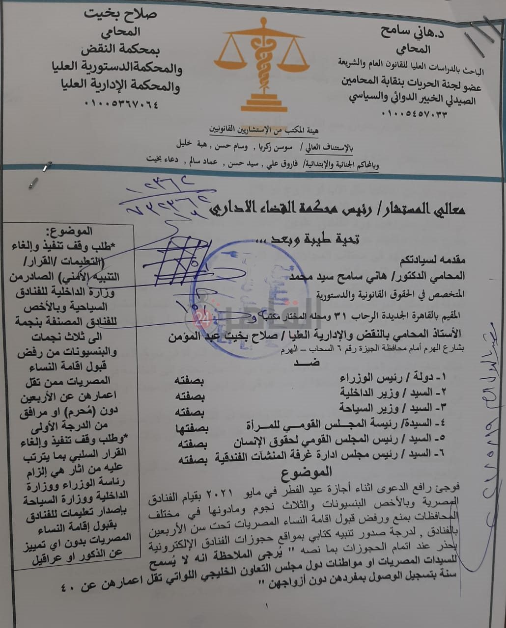 بدوره قال المحامي هاني سامح أحد مقيمي دعوى قضائية ضد هذه الإجراءات، إن هذه الواقعة متكررة، مشيرًات إلى أنه فوجئ وقت حجزه على أحد المواقع الإلكترونية، بتعميم من الفندق بعدم قبول إقامة النساء بالفنادق تحت سن الأربعين إلا بوجود محرم.