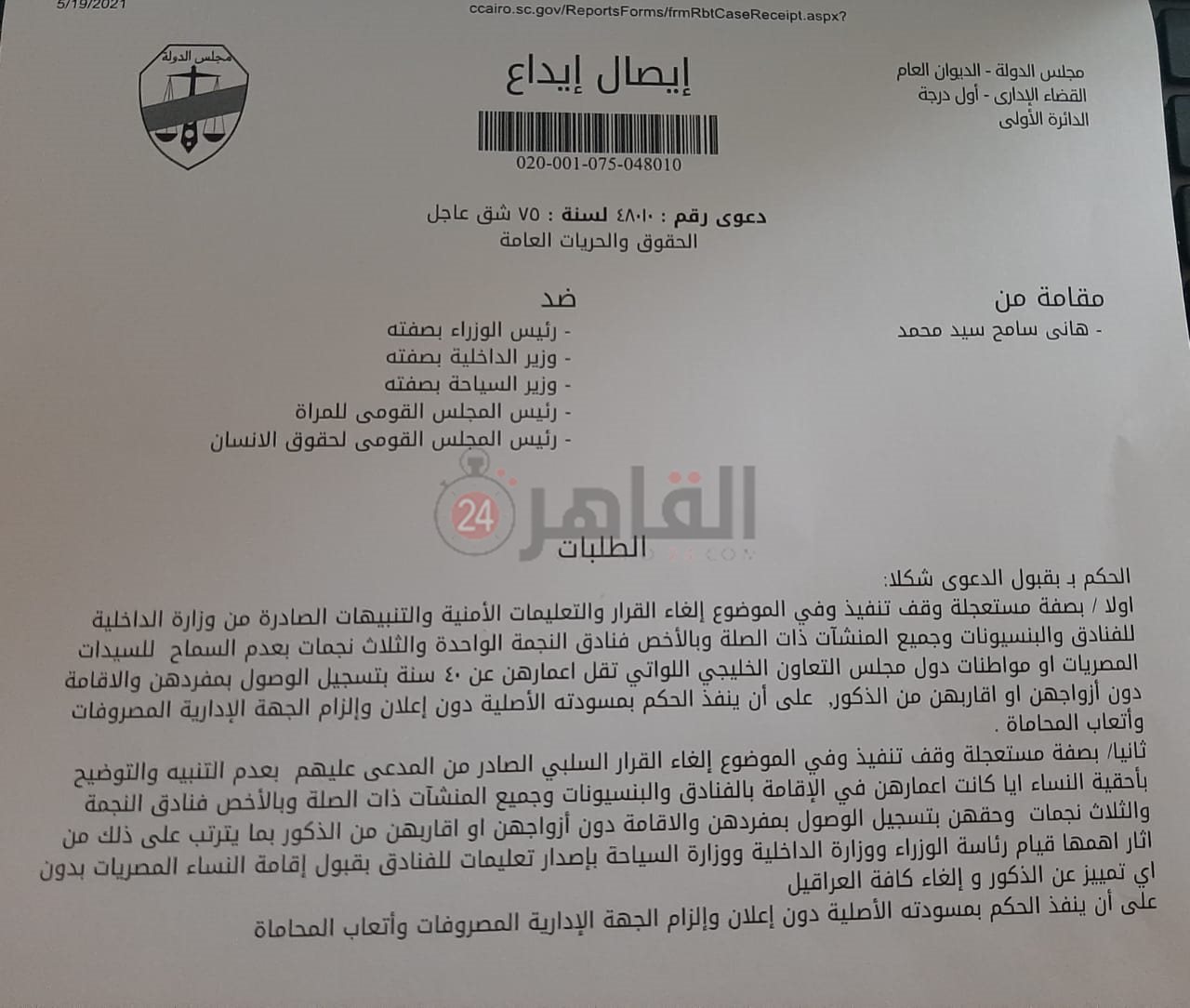 وعن سبب سياسة تلك الفنادق، قال سامح في حديثه لـ "القاهرة 24" إنه تنفيذ لقرارات باطلة لبعض الذكوريين المتسلطين، مستطردًا: "الدولة مكنت المرأة توصل لمنصب القضاء.. ازاي هتمنع ست تبات في فندق لوحدها"، داعيا كل فتاة لديها نفس المشكلة الانضمام للدعوى وتقديم شكواها.