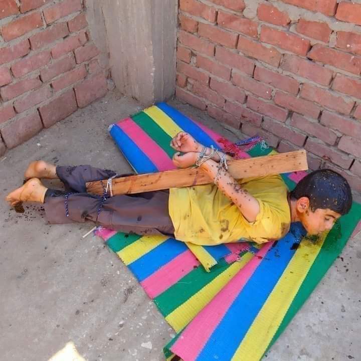 وكان رواد مواقع التواصل الاجتماعي، قد تداولوا صورة لأب يقوم بتعذيب نجله بربطه بحبل وخشب أعلى أحد أسطح المنازل.