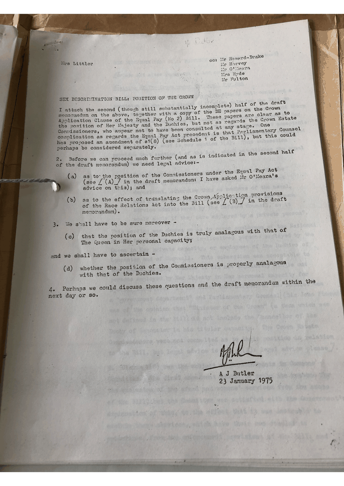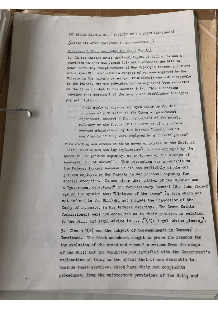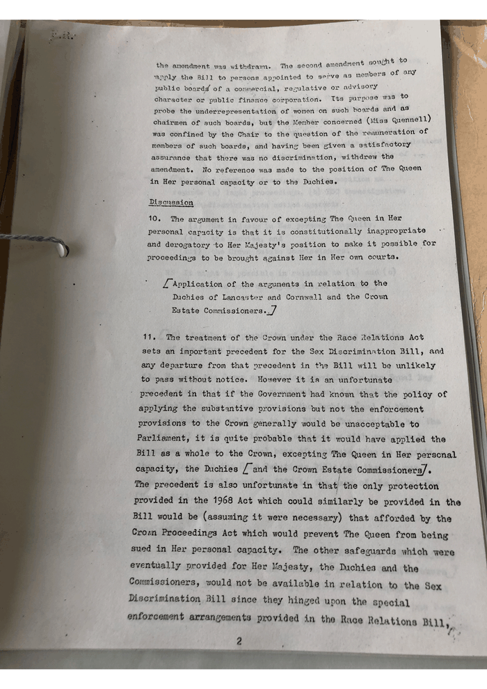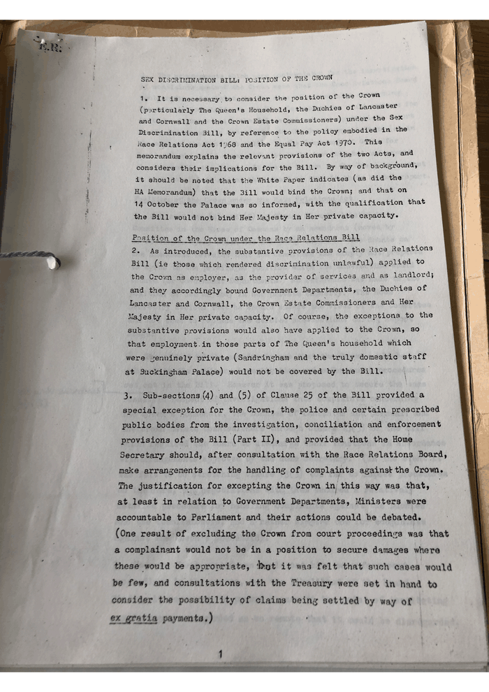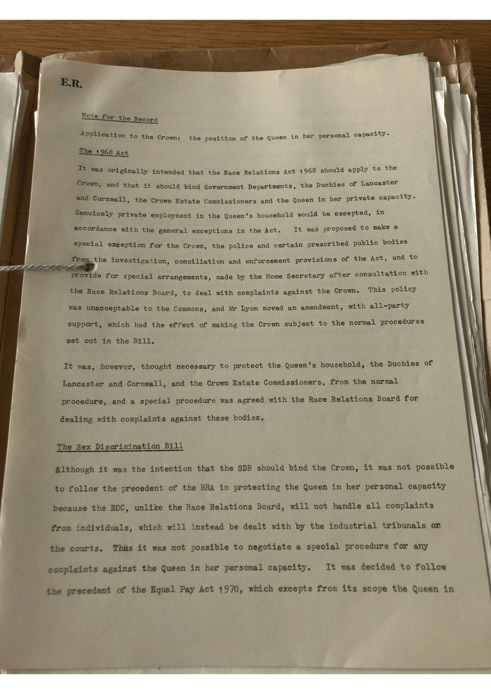 خلال فترة الستينيات، سعى وزراء الحكومة إلى سن قوانين تجعل من غير القانوني رفض توظيف أي فرد على أساس العرق أو اللون، بينما ظلت الملكة مستثناة شخصيًا من قوانين المساواة هذه لأكثر من أربعة عقود، وأدى هذا الإعفاء إلى صعوبة تقديم شكوى من جانب النساء أو الأشخاص من الأقليات العرقية الذين يعملون في منزلها إلى المحاكم إذا كانوا يعتقدون أنهم تعرضوا للتمييز.