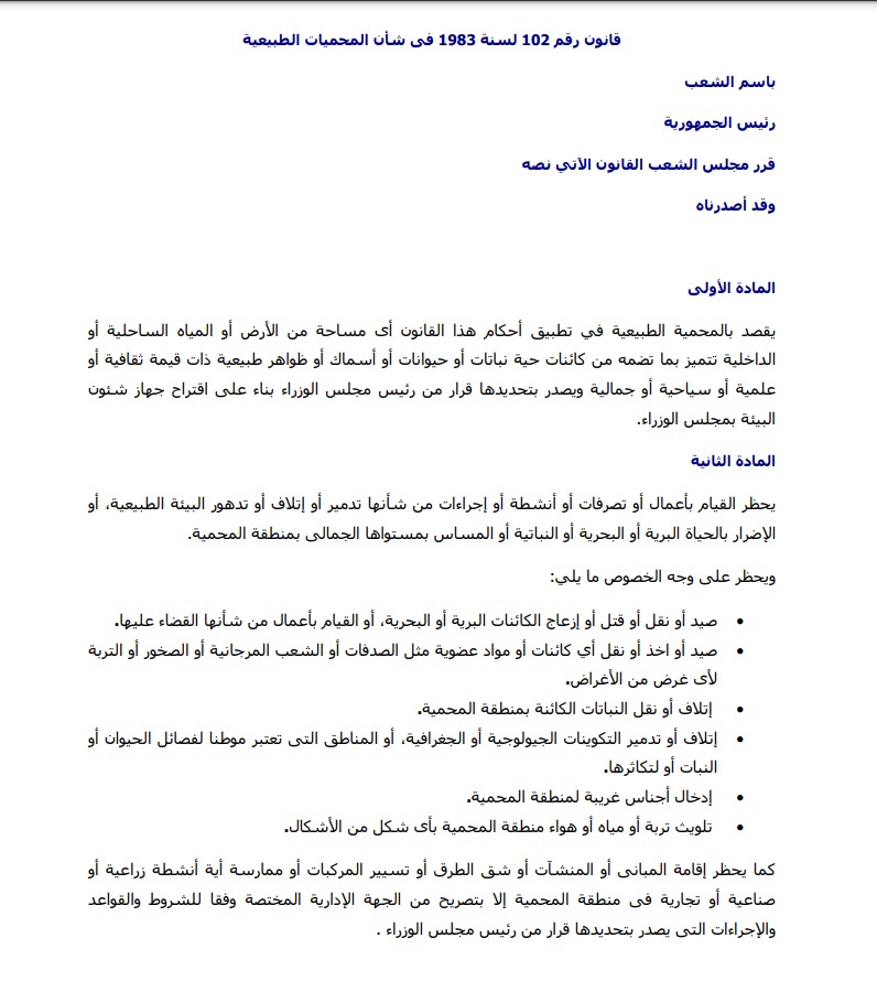 فيما تنص المادة الثانية من قانون البيئة والمحميات الطبيعية رقم 102 لسنة 1983 على أنه: "يحظر القيام بأعمال أو تصرفات أو أنشطة أو إجراءات من شأنها تدمير أو إتلاف أو تدهور البيئة الطبيعية ، أو الإضرار بالحياة البرية أو البحرية أو النباتية أو المساس بمستواها الجمالي بمنطقة المحمية"
