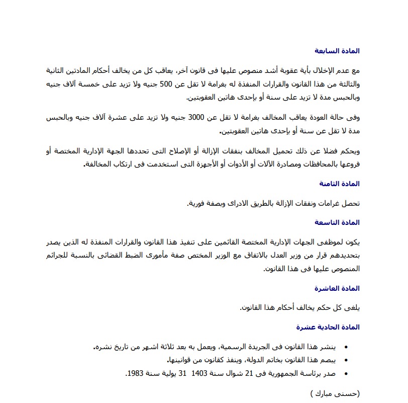 وجاء نص المادة كالتالي: "مع عدم الإخلال بأية عقوبة أشد منصوص عليھا في قانون آخر، يعاقب كل من يخالف أحكام المادتين الثانية والثالثة من ھذا القانون والقرارات المنفذة له بغرامة لا تقل عن 500 جنيه ولا تزيد على خمسة آلاف جنيه، وبالحبس مدة لا تزيد على سنة أو بإحدى ھاتين العقوبتين.