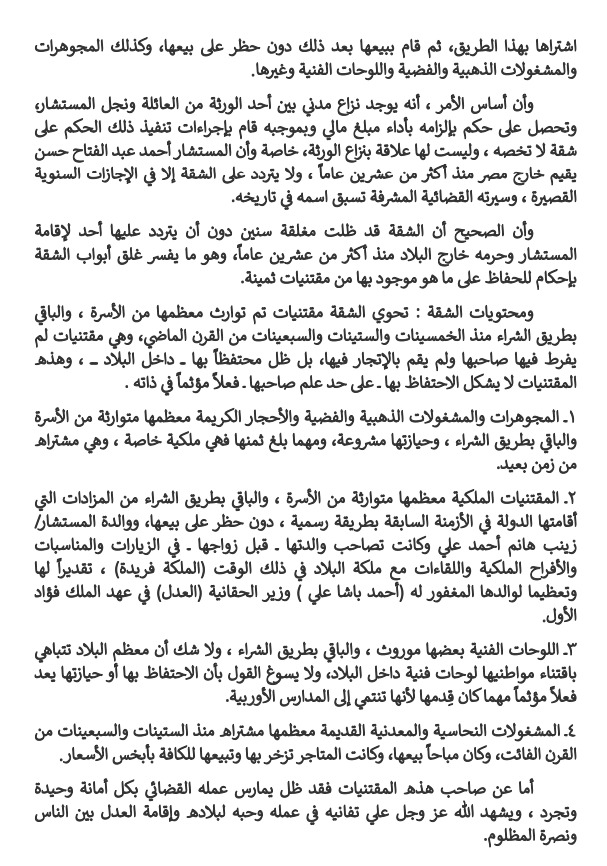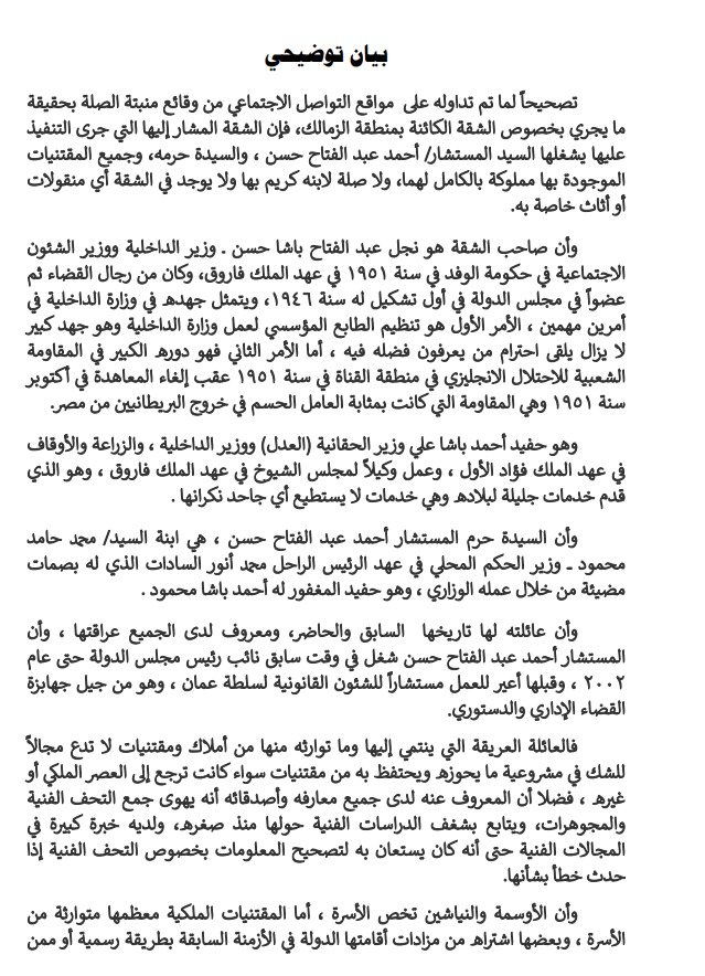 وأردف البيان: "ومحتويات الشقة: تحوي الشقة مقتنيات تم توارث معظمها من الأسرة، والباقي بطريق الشراء منذ الخمسينات والستينات والسبعينات من القرن الماضي، وهي مقتنيات لم يفرط فيها صاحبها ولم يقم بالإتجار فيها، بل ظل محتفظة بها به داخل البلاد، وهذه المقتنيات لا يشكل الاحتفاظ بها . على حد علم صاحبها . فعلا موثمة في ذاته 1- المجوهرات والمشغولات الذهبية والفضية والأحجار الكريمة معظمها متوارثة من الأسرة والباقي بطريق الشراء، وحيازتها مشروعة، ومهما بلغ ثمنها فهي ملكية خاصة، وهي مشتراه من زمن بعيد".