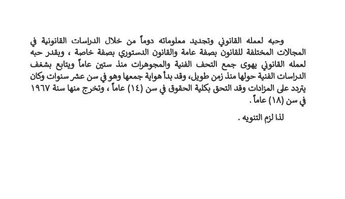 وأكد البيان:" اللوحات الفنية بعضها موروث ، والباقي بطريق الشراء ، ولا شك أن معظم البلاد تتباهي باقتناء مواطنيها لوحات فنية داخل البلاد، ولا يسوغ القول بأن الاحتفاظ بها أو حيازتها يعد فعلًا مؤثمًا مهما كان قدمها لأنها تنتمي إلى المدارس الأوربية المشغولات النحاسية والمعدنية القديمة معظمها مشتراه منذ الستينات والسبعينات من القرن الفائت، وكان مباح بيعها، وكانت المتاجر تزخر بها وتبيعها للكافة بأبخس الأسعار، وأما عن صاحب هذه المقتنيات فقد ظل يمارس عمله القضائي بكل أمانة وحيدة وتجرد ، ويشهد الله عز وجل علي تفانيه في عمله وحبه لبلاده وإقامة العدل بين الناس ونصرة المظلوم".