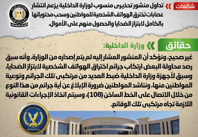 وتواصل المركز الإعلامي لمجلس الوزراء بالتواصل مع وزارة الداخلية، التي أكدت أن المنشور المشار إليه لم يتم إصداره من الوزارة، وأنه سبق رصد محاولة البعض ارتكاب جرائم اختراق الهواتف الشخصية لابتزاز الضحايا، وسبق لأجهزة وزارة الداخلية ضبط العديد من مرتكبي تلك الجرائم وتوعية المواطنين منها، مناشدة المواطنين ضرورة الإبلاغ عن أي جرائم من هذا النوع من خلال الاتصال على الخط الساخن (108)، وسيتم اتخاذ الإجراءات القانونية اللازمة تجاه مرتكبي تلك الوقائع.
