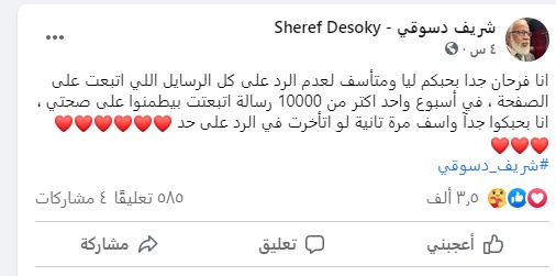 وكتب "دسوقي" عبر صفحته الرسمية بموقع التواصل الاجتماعي "فيس بوك": "أنا فرحان جدًا بحبكم ليا ومتأسف لعدم الرد على كل الرسايل اللي اتبعت على الصفحة".