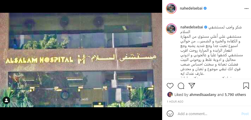 وكتبت ناهد السباعي منشورًا عبر حسابها الشخصي بموقع تبادل الصور والفيديوهات “انستحرام”، وقالت: "من حوالي أسبوع تعبت جدا وجع شديد يشبه وجع انفجار الزايدة والمرارة، روحت أقرب مستشفى كشفوا عليا وعالجوني وأدوني محاليل وأدوية غلط وروحوني البيت فضلت تعبانة وسخنت، إحساس صعب قوي أنك تبقى موجوع وتعبان ومحدش عارف عندك إيه".