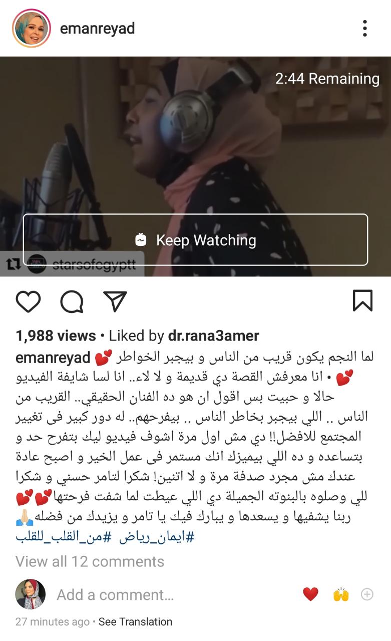 ونشرت إيمان رياض، الفيديو عبر حسابها الشخصي بموقع “انستجرام”، وعلقت على الفيديو قائلة: “لما النجم يكون قريب من الناس و بيجبر الخواطر.. أنا معرفش القصة دي قديمة ولا لاء.. أنا لسه شايفة الفيديو حالا وحبيت بس اقول أن هو ده الفنان الحقيقي، القريب من الناس، للي بيجبر بخاطر الناس و بيفرحهم”.