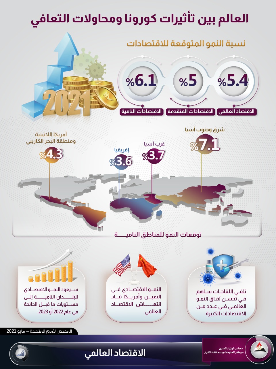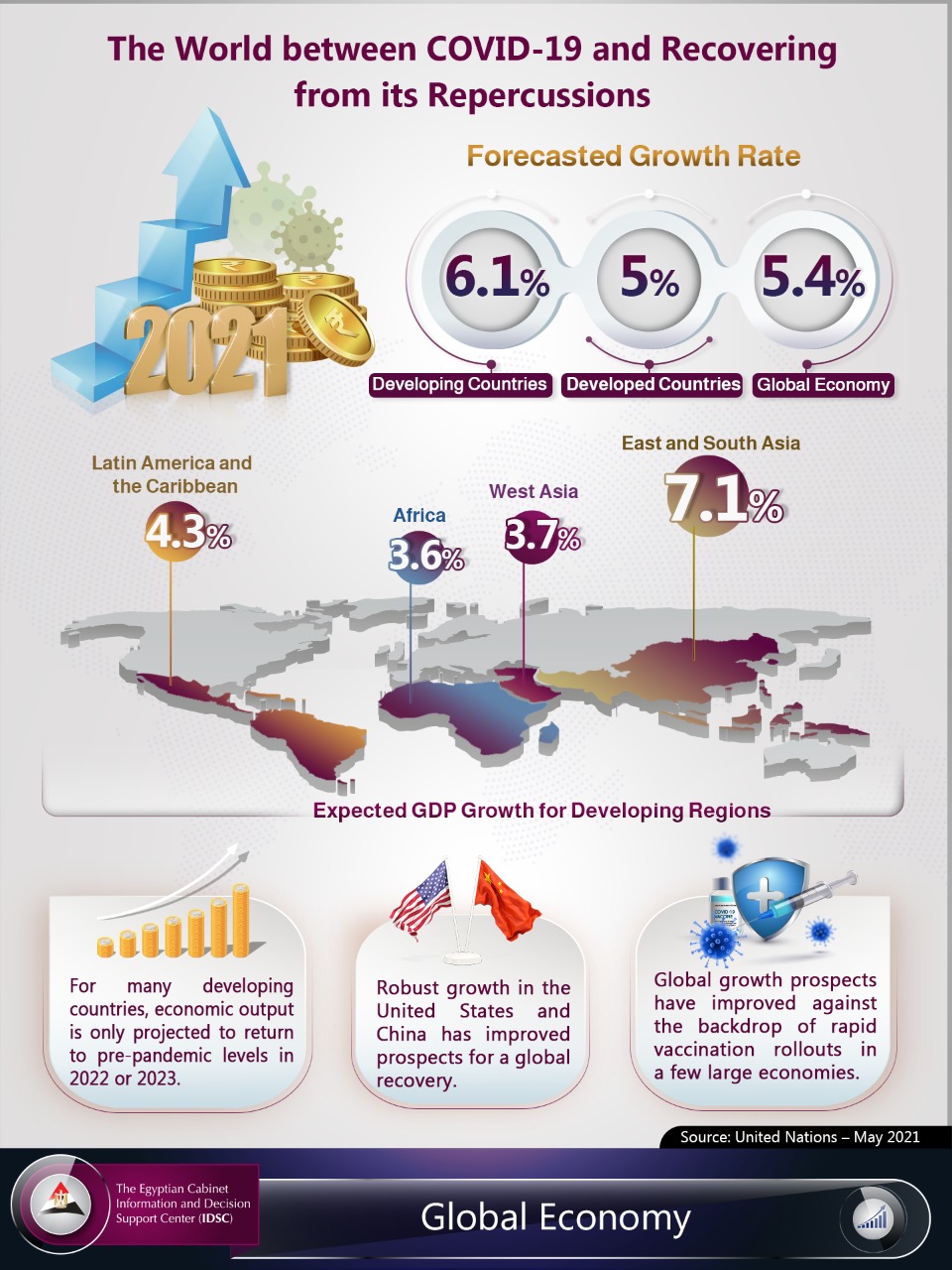 وفقًا للأمم المتحدة، فإن الاقتصاد العالمي سيشهد معدل نمو بنسبة 5.4% وكذلك الاقتصادات المتقدمة بنسبة 5%، وأيضًا الاقتصادات النامية بشكل عام ستشهد معدل نمو 6.1% خلال 2021، وبشكل خاص؛ ستشهد إفريقيا معدل نمو 3.6%، ومنطقة شرق وجنوب آسيا 7.1%، وغرب آسيا 3.7%، وأمريكا اللاتينية والبحر الكاريبي 4.3%.