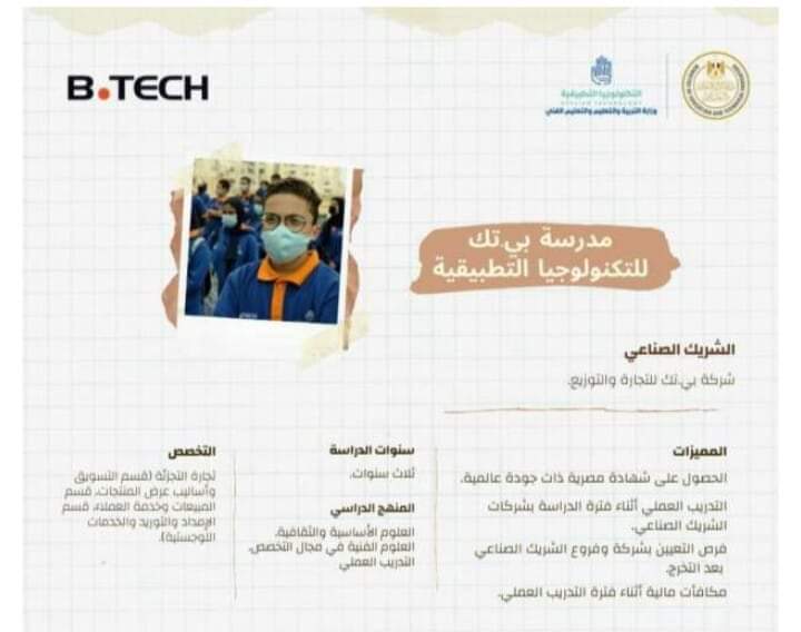 وأضافت الوزارة أن مدرسة “بي تك” للتكنولوجيا التطبيقية، بها العديد من المُميزات المهمة، والتي تتمثل في حصول الطالب على شهادة مِصرية ذات جودة عالمية، والتدريب العملي أثناء فترة الدراسة بشركات الشريك الصناعي، مع وجود فرص تعيين بشركة وفروع الشريك الصناعي بعد التخرج، فضلًا عن الحصول على مُكافآت مالية أثناء فترة التدريب.