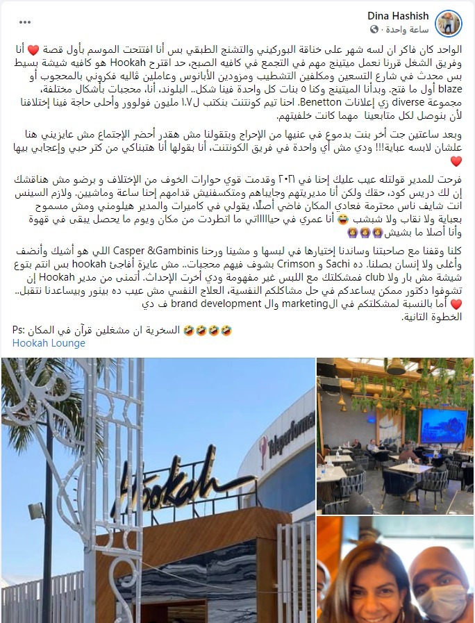 وأكملت حديثها، فقالت: "كلنا وقفنا مع صاحبتنا، وساندنا في اختيارها في لبسها و مشينا ورحنا كافيه تاني، بس متفاجئة منهم، لأنهم بتوع شيشة مش بار ولا club، فمشكلتك مع اللبس غير مفهومة ودي أخرت الإحداث، أتمنى من مدير المكان إن تشوفوا دكتور يساعدكم في حل مشاكلكم النفسية".