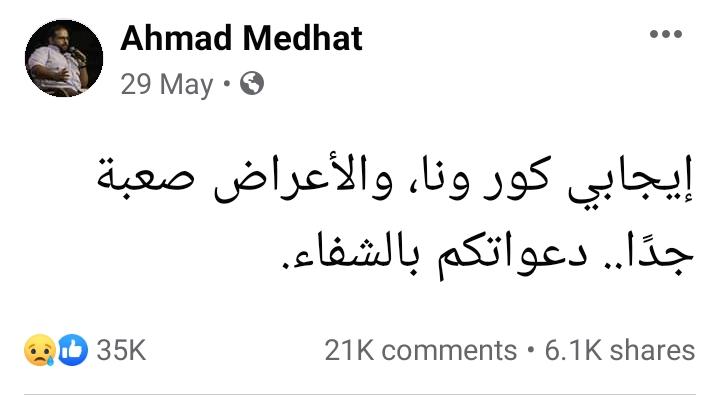 وكتب "مدحت" آخر منشور له عبر موقع التواصل الاجتماعي " فيس بوك"، فقال: "إيجابي كورونا، الأعراض صعبة جدًا، دعواتكم بالشفاء".