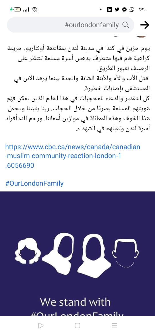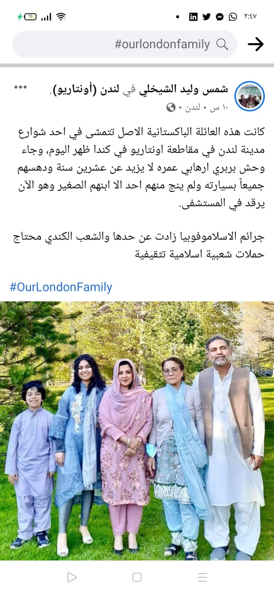 تداول نشطاء موقع التواصل الاجتماعي "فيس بوك" هاشتاج بعنوان: "our london family"، وذلك بعد مصرع عائلة مسلمة بالكامل في حادث مروع بأحد شوارع لندن.