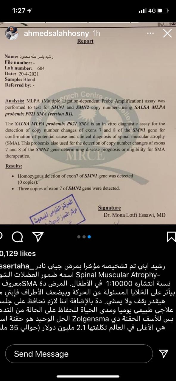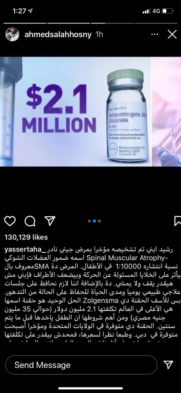 ونشر أحمد صلاح منشور ياسر طه والد الطفل رشيد، الذي أشار خلاله إلى تفاصيل حالة الطفل، مرفقةً بالتقارير الطبية، ومدى غلاء العلاج كونه حقنة يبلغ سعرها ما يقرب من 35 مليون جنيه.