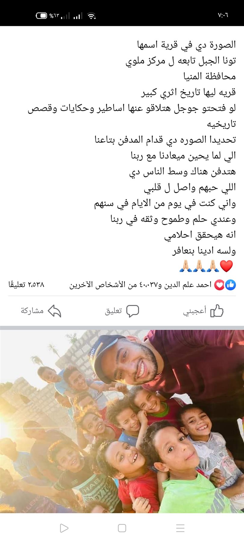 ونشر "السقا"، الصور على صفحته الشخصية بموقع التواصل الاجتماعي فيس بوك، ودون بجوارها "دي في قرية اسمها تونا الجبل تابعة لمركز ملوي - محافظة المنيا، قرية ليها تاريخ أثري كبير، لو فتحتوا جوجل هتلاقوا عنها أساطير وحكايات وقصص تاريخيه، تحديدا الصورة دي قدام المدفن بتاعنا، اللي لما يحين ميعادنا مع ربنا، هتدفن هناك وسط الناس دي، اللي حبهم واصل لقلبي، وإني كنت في يوم من الايام في سنهم، وعندي حلم وطموح وثقه في ربنا، إنه هيحقق احلامي، ولسه ادينا بنعافر".