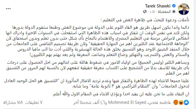 وأضاف شوقي في منشور على موقع التواصل الاجتماعي “فيس بوك” أن “الوجاهة الاجتماعية عند الكثيرين أهم من المهارة الحقيقية ولأن طريقة تصميم التنافس على الجامعات من خلال المنفذ الضيق الأوحد وهو التنسيق يخلق هذه الحالة الهستيرية والتي أدت بنا إلى مافيا الدروس والسناتر والغش والتسريب والتهكير، وضاع التعلم وضاعت المعرفة ولم يعد يهتم بهم الكثيرون”.