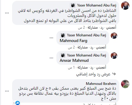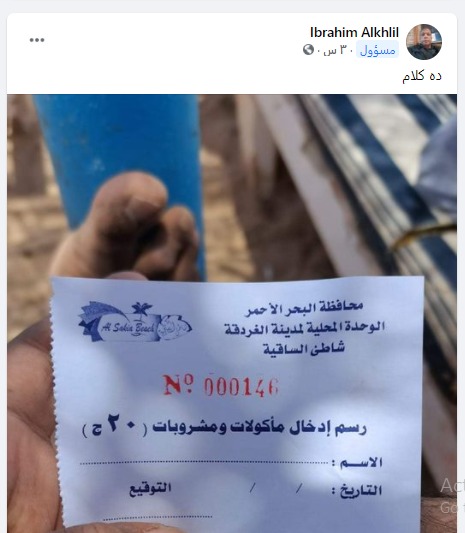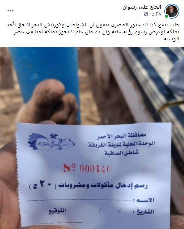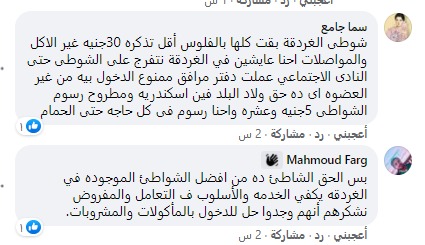 عبر نشطاء موقع التواصل الاجتماعي "فيس بوك"، عن استيائهم من فرض رسوم على دخول المأكولات والمشروبات بأحد شواطئ مدينة الغردقة، وقال ناشط يدعى على رشوان في تدوينة له: "الدستور المصري ينص في المادة 44 والمادة 45 والمادة 46 بحق المواطن بالتمتع بالشواطئ دون مقابل مادي أما المرافق التي أقيمت عليه إذا استخدمتها يحق لهم أخذ مقابل منك".