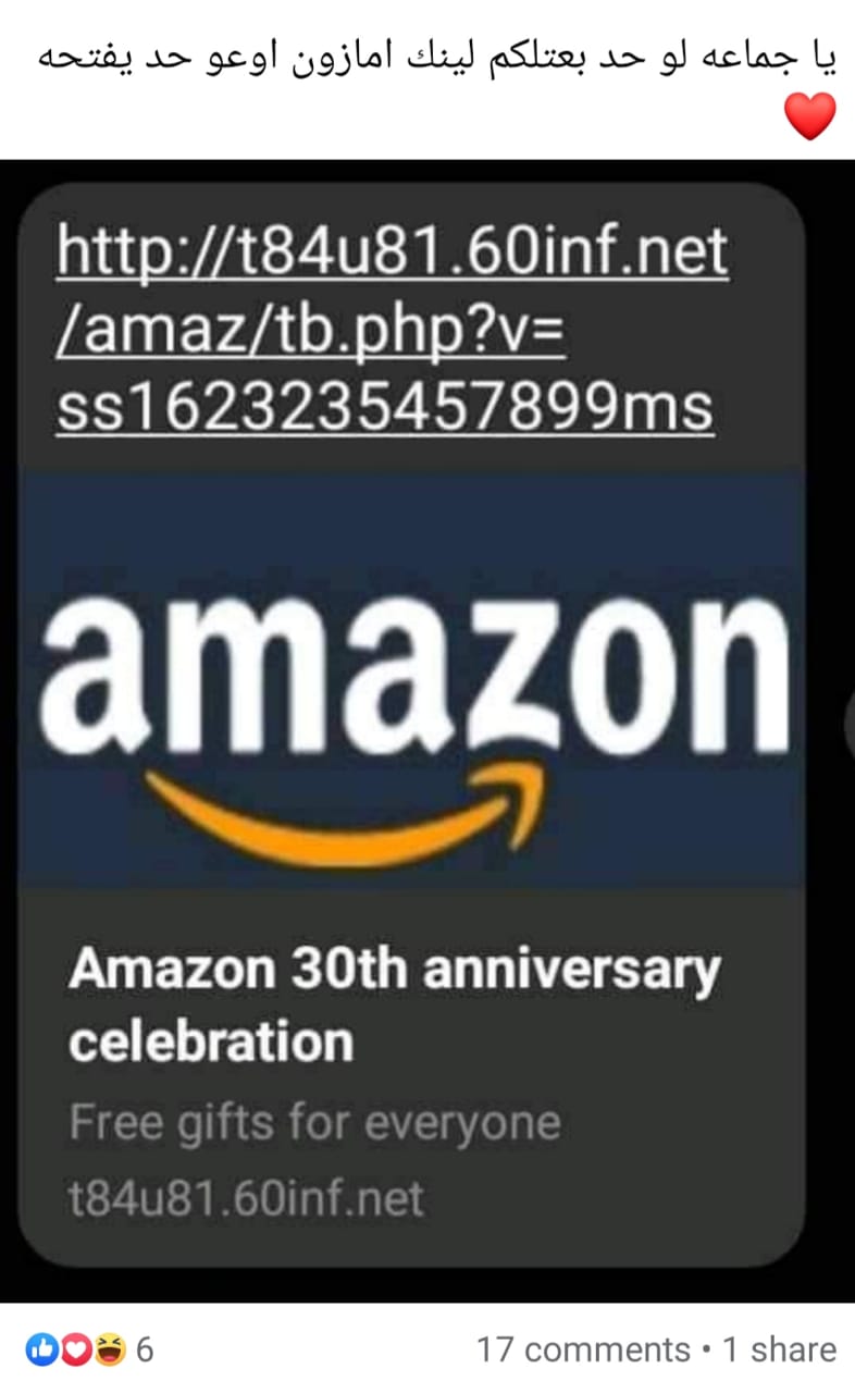 تداول مستخدمو مواقع التواصل الاجتماعي فيس بوك وواتس آب، رابطًا إلكترونيًّا يظهر صورًا لشعار شركة أمازون الأمريكية؛ ويحث المستخدمين للضغط عليه لربح جوائز مختلفة بمناسبة احتفال الشركة بمرور 30 عامًا على إنشائها، ما أحدث جدلًا واسعًا خلال الساعات القليلة الماضية.
