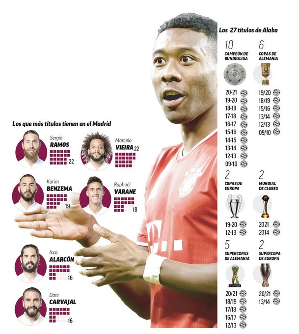 وأبرزت الصحيفة الإسبانية بطولات ألابا، قبل الانضمام إلى الميرنجي، حيث حقق 27 بطولة بقميص فريقه السابق بايرن ميونخ الألماني قبل الانضمام إلى ريال مدريد.