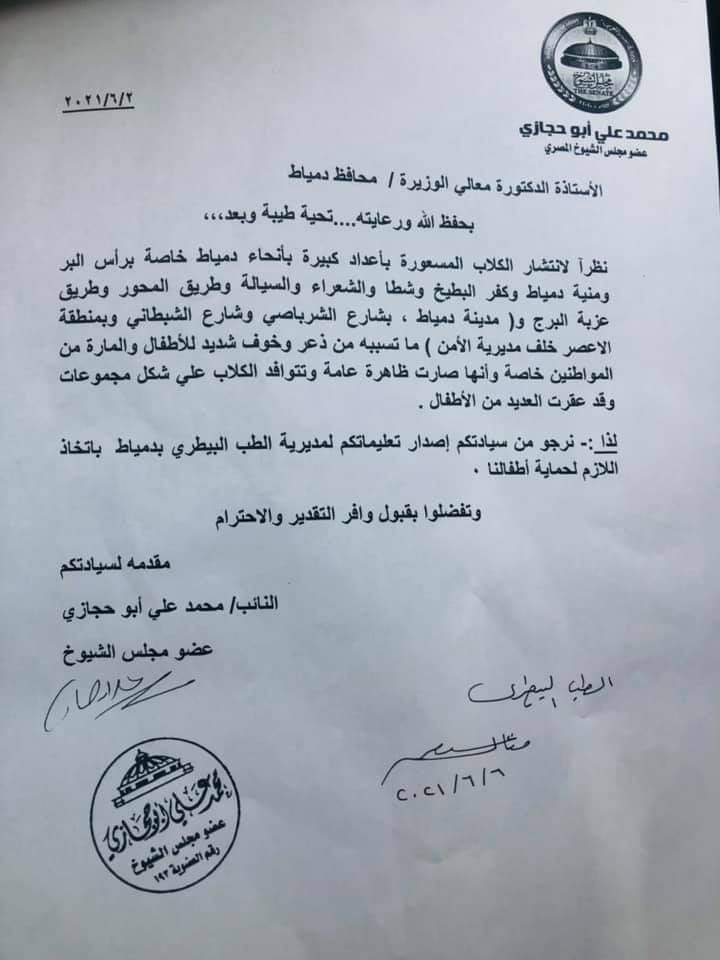 وفى السياق ذاته، تقدم محمد أبو حجازي، عضو مجلس الشيوخ بمذكرة إلى الدكتورة منال عوض محافظ دمياط يطالبها باتخاذ إجراءات لحماية الأطفال من هجمات الكلاب المسعورة التي تهاجم الأطفال وتسير في تجمعات في عدة مناطق بدمياط.