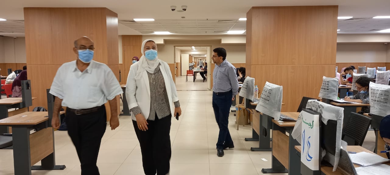 وتفقدت أماني أسامة كامل، عميد الكلية، يرافقها الدكتور رحاب عثمان، وكيل الكلية لشئون الطلاب، والدكتور رولا ميلاد، وكيل الكلية لشئون خدمة المجتمع وتنمية البيئة، لجان الامتحانات والتأكد من اتخاذ الإجراءات الاحترازية والتي تتمثل في عمل مسارات مختلفة للدخول والخروج مع وضع علامات إرشادية بذلك، وعمل مسافات آمنة ووضع ملصقات إرشادية لأماكن الوقوف لقياس الحرارة لجميع الطلبة والعاملين وأعضاء هيئة التدريس، قبل الدخول للكلية والتأكد من التزام الجميع بارتداء الكمامة، والتعقيم المستمر لأماكن الامتحانات والمسارات قبل الامتحانات.