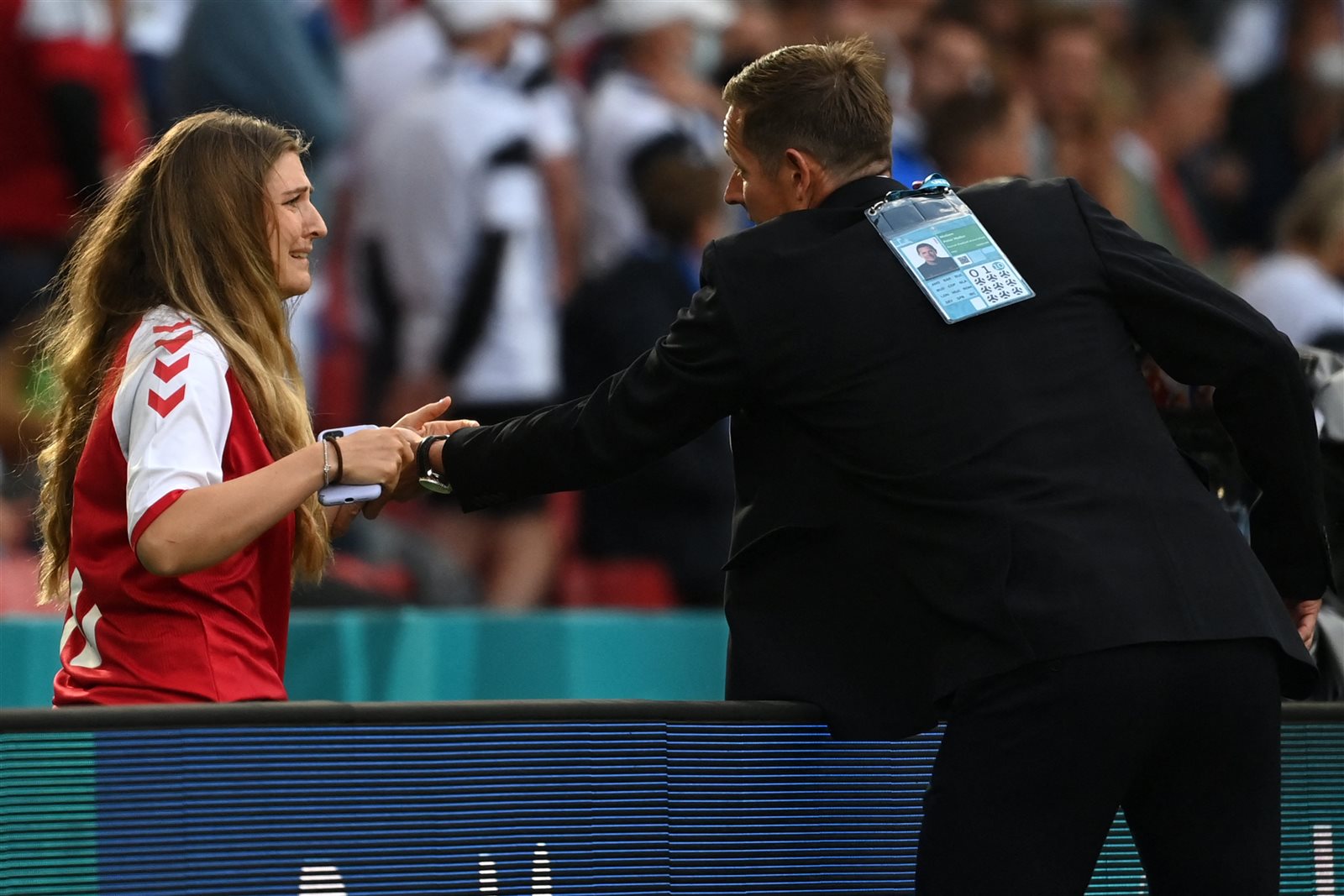 انهارت زوجة النجم الدنماركي كريستيان إريكسن، لاعب فريق إنتر الإيطالي، بعد سقوط اللاعب في مباراة منتخب الدنمارك أمام فنلندا، “يورو 2020”.