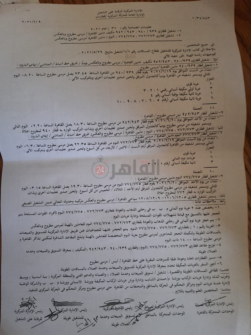 - تشغيل قطاري 939 / 940 / 943 / 942 مكيف ما بين القاهرة / مرسى مطروح، وبالعكس يوميا طريق خط إمبابة - المناشي - إيتاي البارود، وذلك ابتداء من السبت 19 يونيو الحالي، حيث يتحرك القطار 939 / 940 من القاهرة الساعة 23.45 يصل مرسى مطروح الساعة 08.20 اليوم التالي، ويستمر تشغيله من القاهرة يومية كالجدول المرفق ولحين صدور تعلیمات أخرى وبالتركيب الآتي: