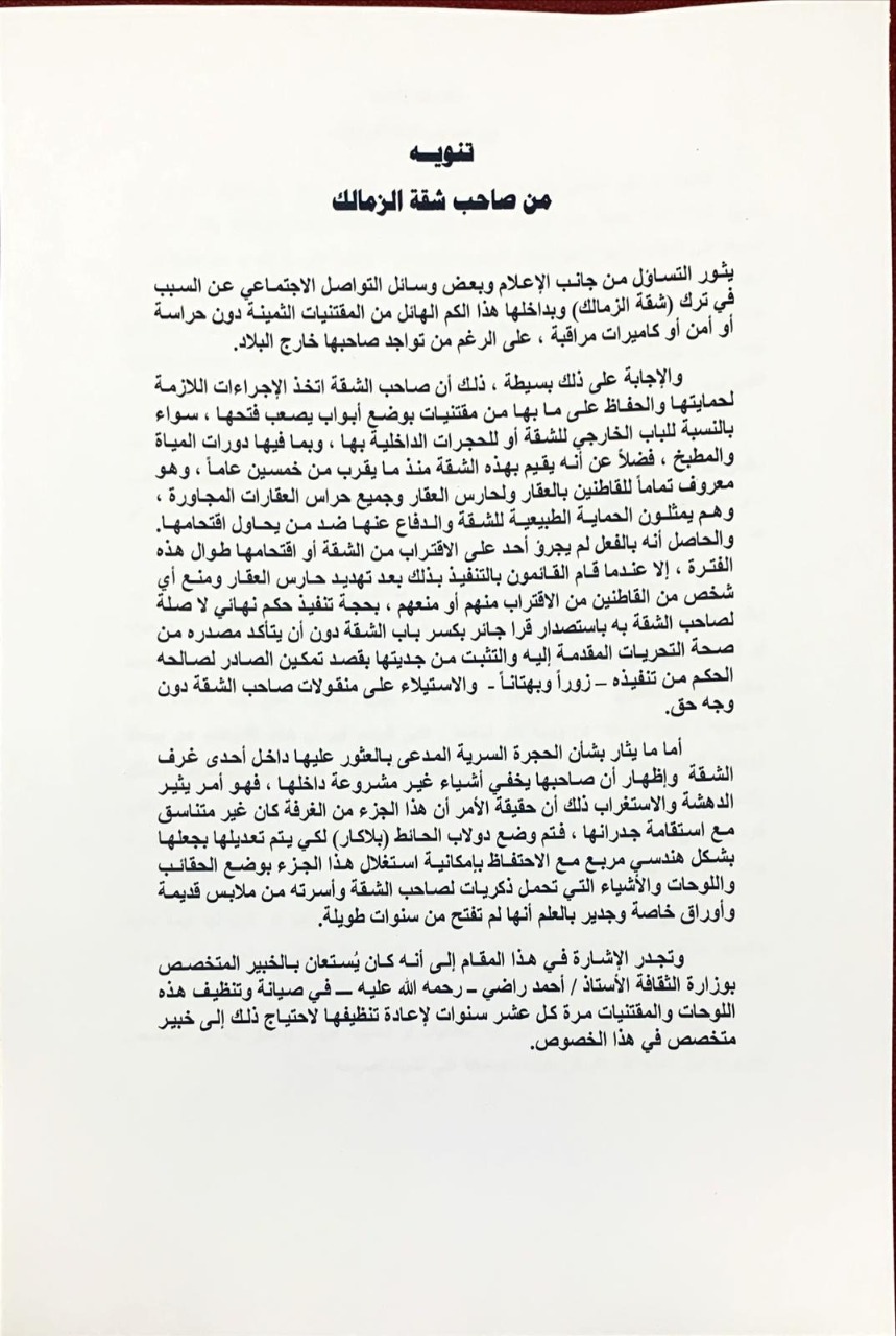 وأردف:"أمّا ما يثار بشأن الحجرة السرية المُدعى بالعثور عليها داخل إحدى غرف الشقة، وإظهار أن صاحبها يخفى أشياء، فحقيقة الأمر أن هذا الجزء من الغرفة كان غير متناسق مع استقامة جدرانها، فتم وضع دولاب الحائط “بلاكار”، لكى يتم تعديلها بجعلها بشكل هندسي مربع، مع الاحتفاظ بإمكانية استغلال هذا الجزء، بوضع الحقائب واللوحات والأشياء التي تحمل ذكريات لصاحب الشقة وأسرته، من ملابس قديمة وأوراق خاصة، وجدير بالعلم أنها لم تُفتح منذ سنوات طويلة".