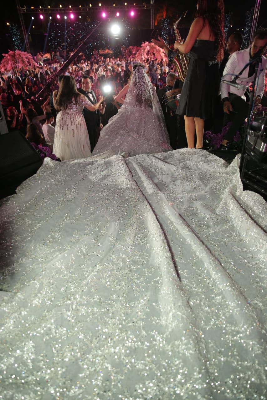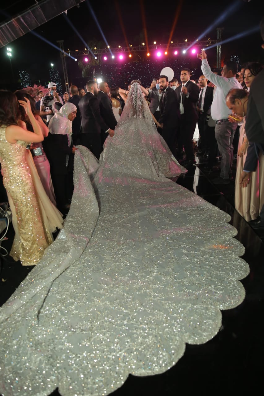 تألقت العروس بفستان زفاف خطف أنظار الحضور من تصميم هاني البحيري، والذي استغرق في تصميمه قرابة الـ5 أشهر هو مصنوع من الدانتيل الفضي المشغول بخيوط الحرير.