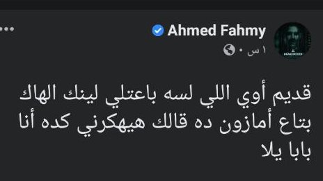 وسخر فهمي، من مُحاولة السرقة، قبل سرقة الصفحة الفنية بدقائق قليلة، وكتب عبر حسابه الشخصي على "فيس بوك": "قديم أوي اللي لسة باعتلي لينك الهاك بتاع أمازون ده قالك هيهكرني كده أنا بابا يلا".