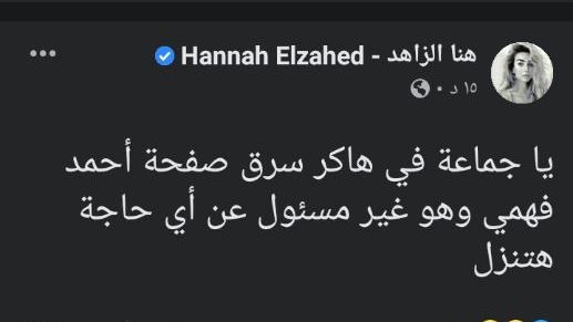 وكتبت هنا عبر صفحتها الفنية على “فيس بوك”: “يا جماعة في هاكر سرق صفحة أحمد فهمي، وهو غير مسئول عن أي حاجة هتنزل”.