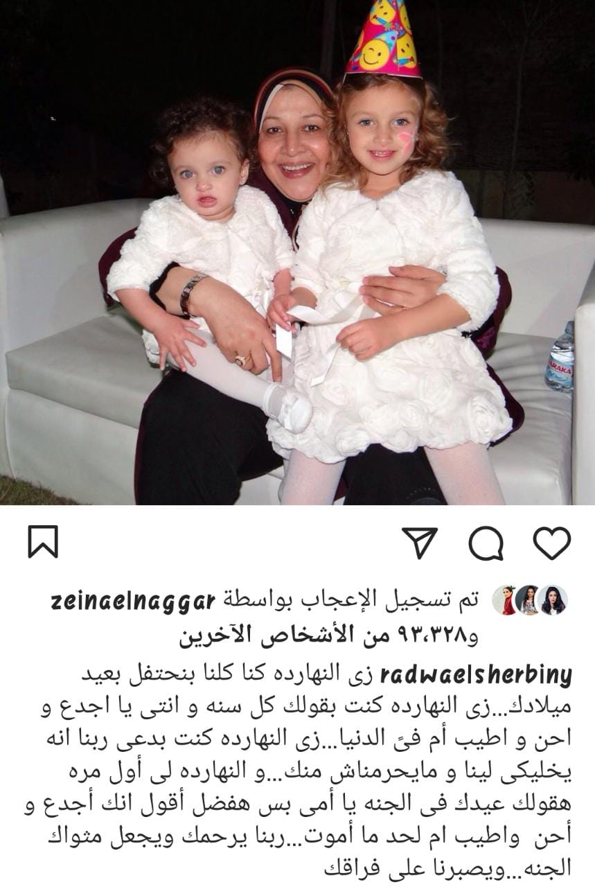ونشرت رضوى الشربيني صورة والدتها برفقة بناتها، عبر حسابها الشخصي على موقع تبادل الصور والفيديوهات القصيرة "إنستجرام"، وعلقت عليها قائلةً: "زي النهارده كنا كلنا بنحتفل بعيد ميلادك، زي النهارده كنت بقولك كل سنة وأنتي أجدع وأحن وأطيب أم في الدنيا، زي النهارده كنت بدعي ربنا أنه يخليكي لينا وميحرمناش منك".