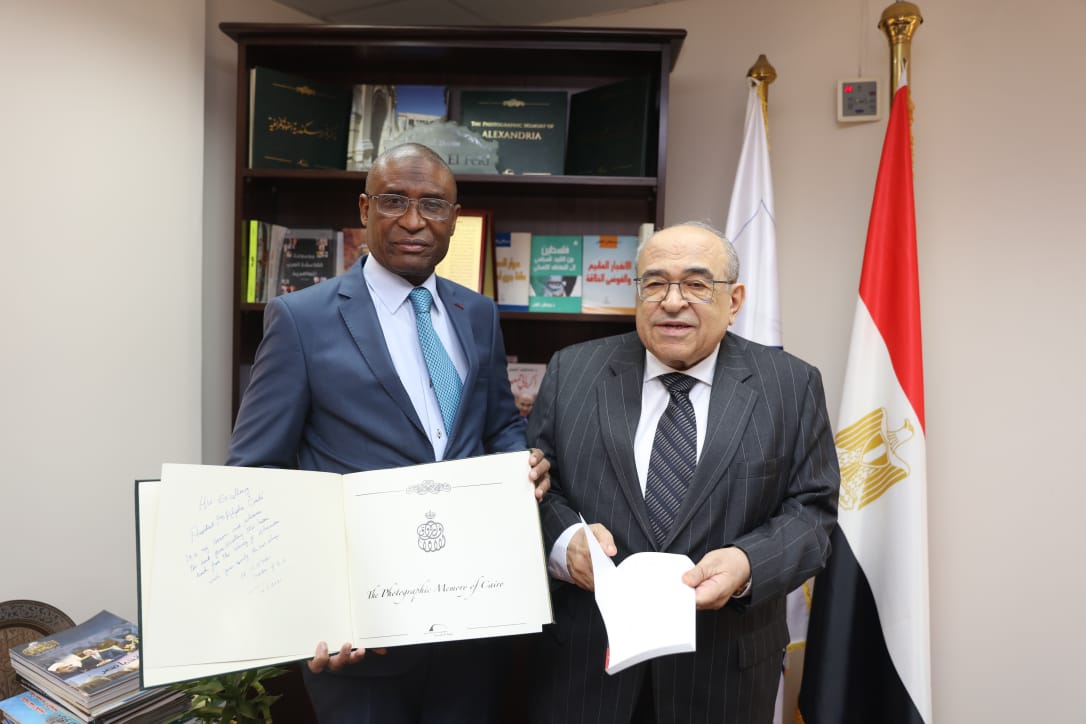 وأهدى الدكتور مصطفى الفقي كتاب "ذاكرة القاهرة الفوتوغرافية"، ومجموعة من إصدارات المكتبة لسفارة غينيا بالقاهرة.