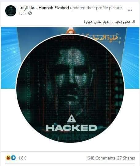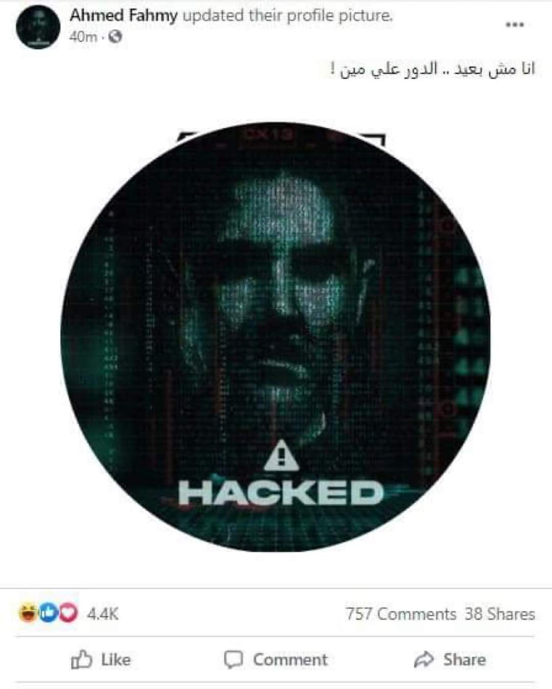 واستخدم مخترق الحساب الإلكتروني على “فيسبوك” جملة “أنا مش بعيد.. الدور على مين”، ليدخل الفنان مصطفى خاطر بعدهما ببضعة دقائق أخرى في ماراثون اختراق الحسابات على “فيس بوك”.
