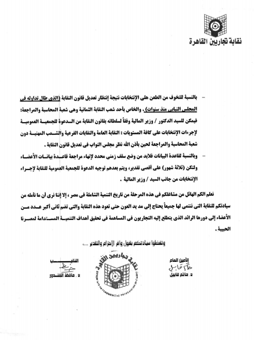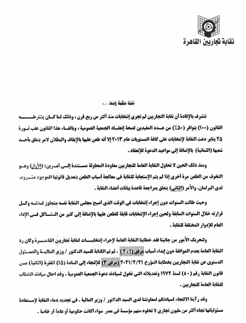 واستكملت: “لتحريك الأمور من جانبنا، خاطبنا النقابة العامة لإجراء انتخابات نقابة التجاريين القاهرة، وكان رد النقابة العامة بعدم الموافقة دون إبداء أي أسباب، ثم تم الكتابة للدكتور وزير المالية، والمسئول الدستوري عن نقابة التجاريين، بخطابنا المؤرخ 21-2-2021، للالتجاء إلى المادة 15 الفقرة الثالنية من قانون النقابة رقم 40 لسنة 1972 وتعديلاته التي تخول لسيادته دعوة الجمعية العمومية، وقد أحيل الخطاب إلى النقابة العامة للتجاريين”.