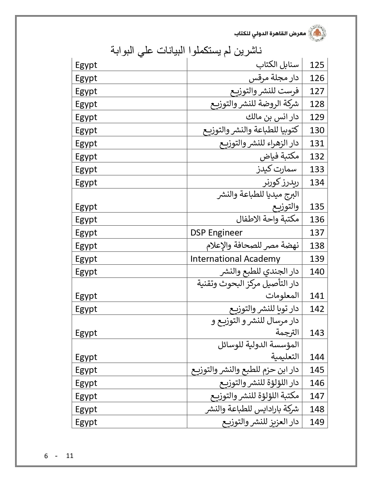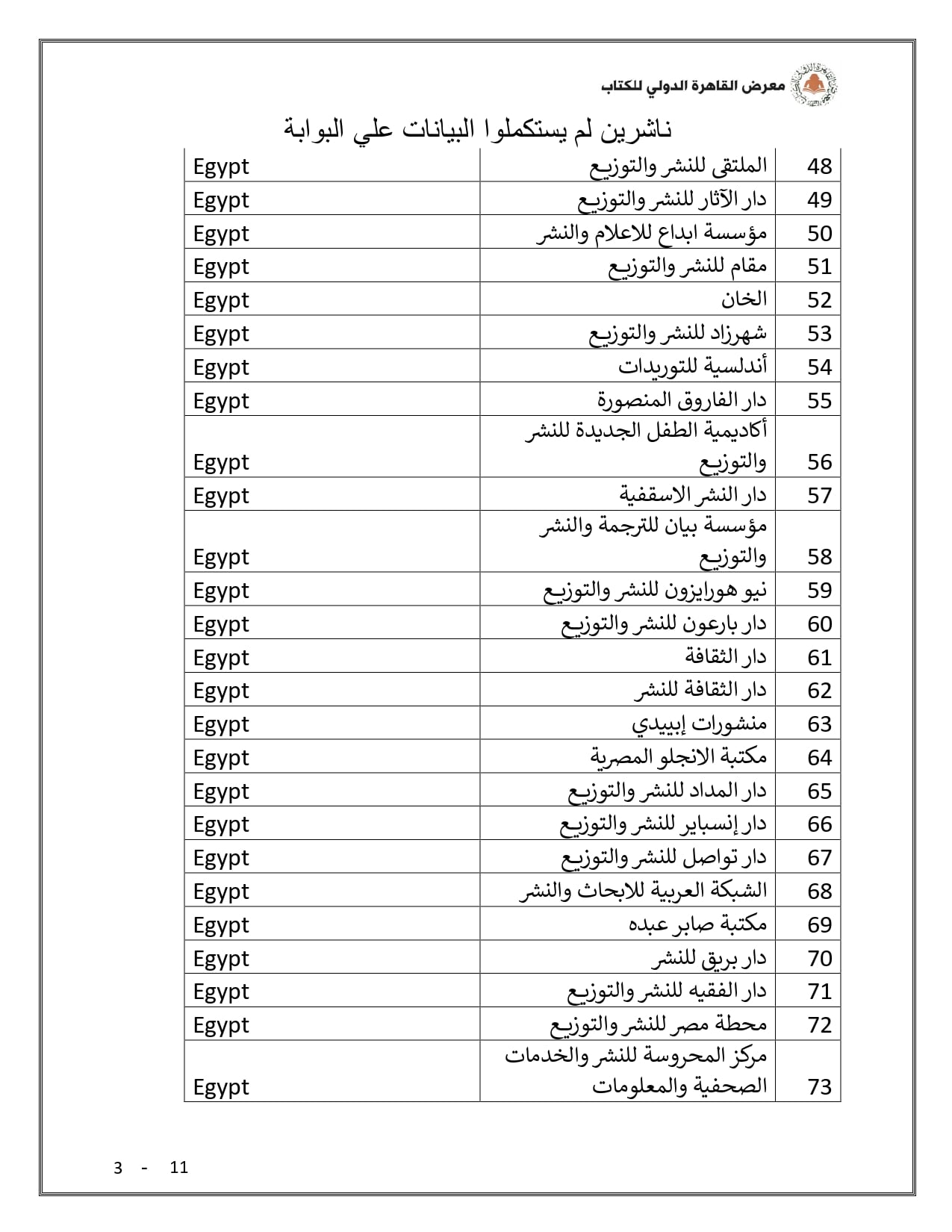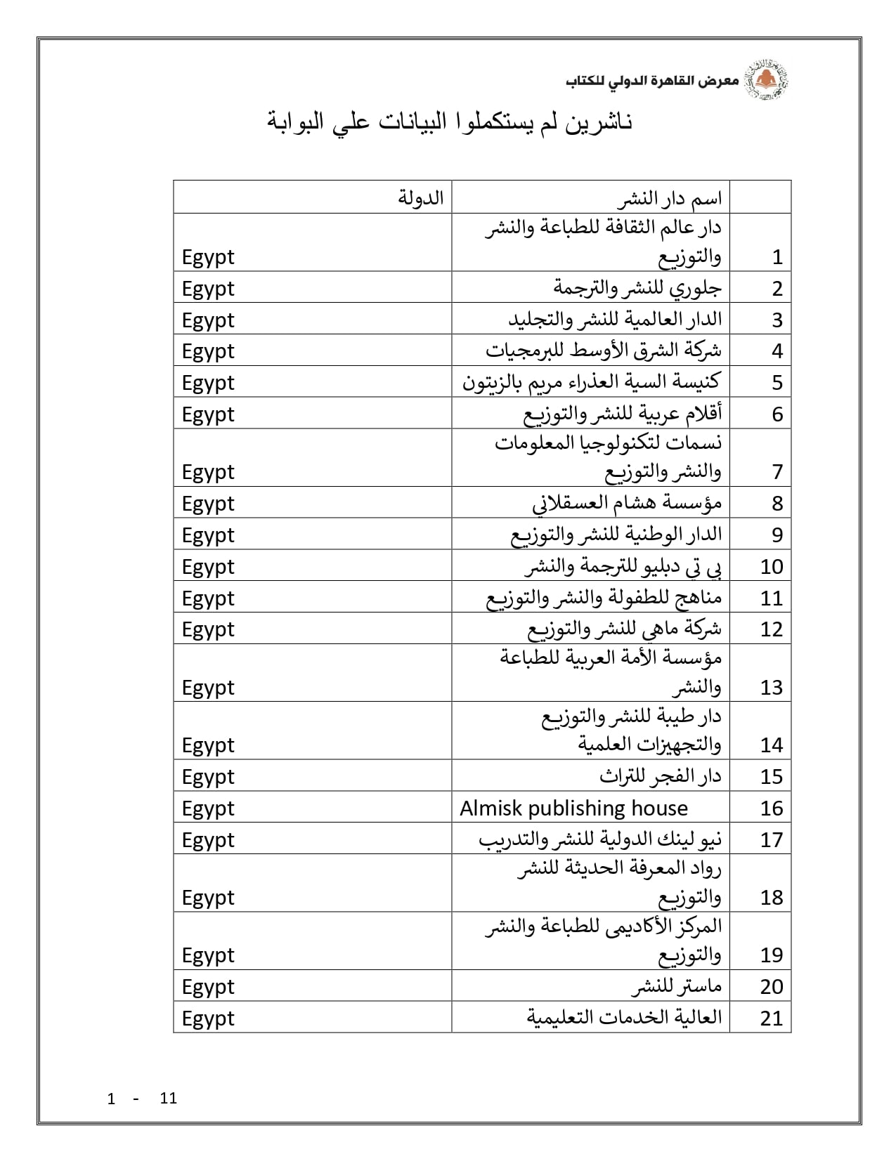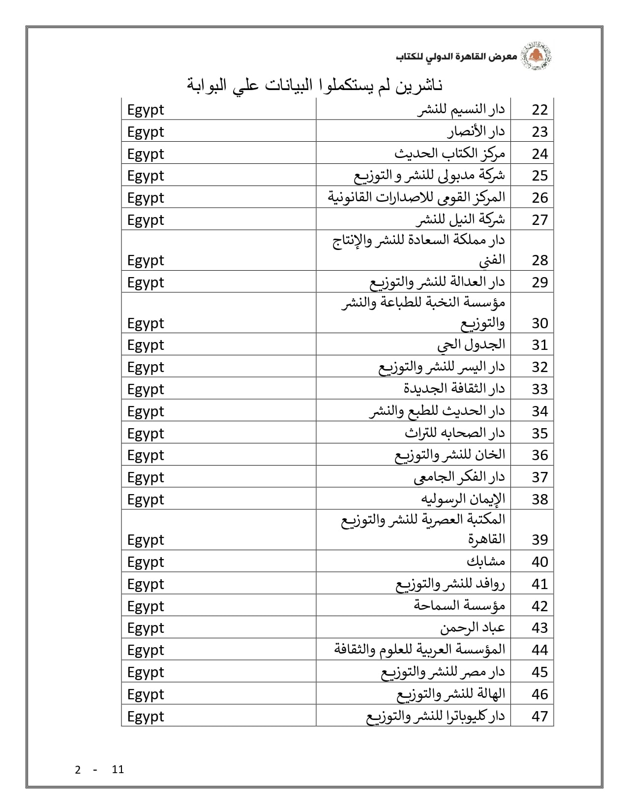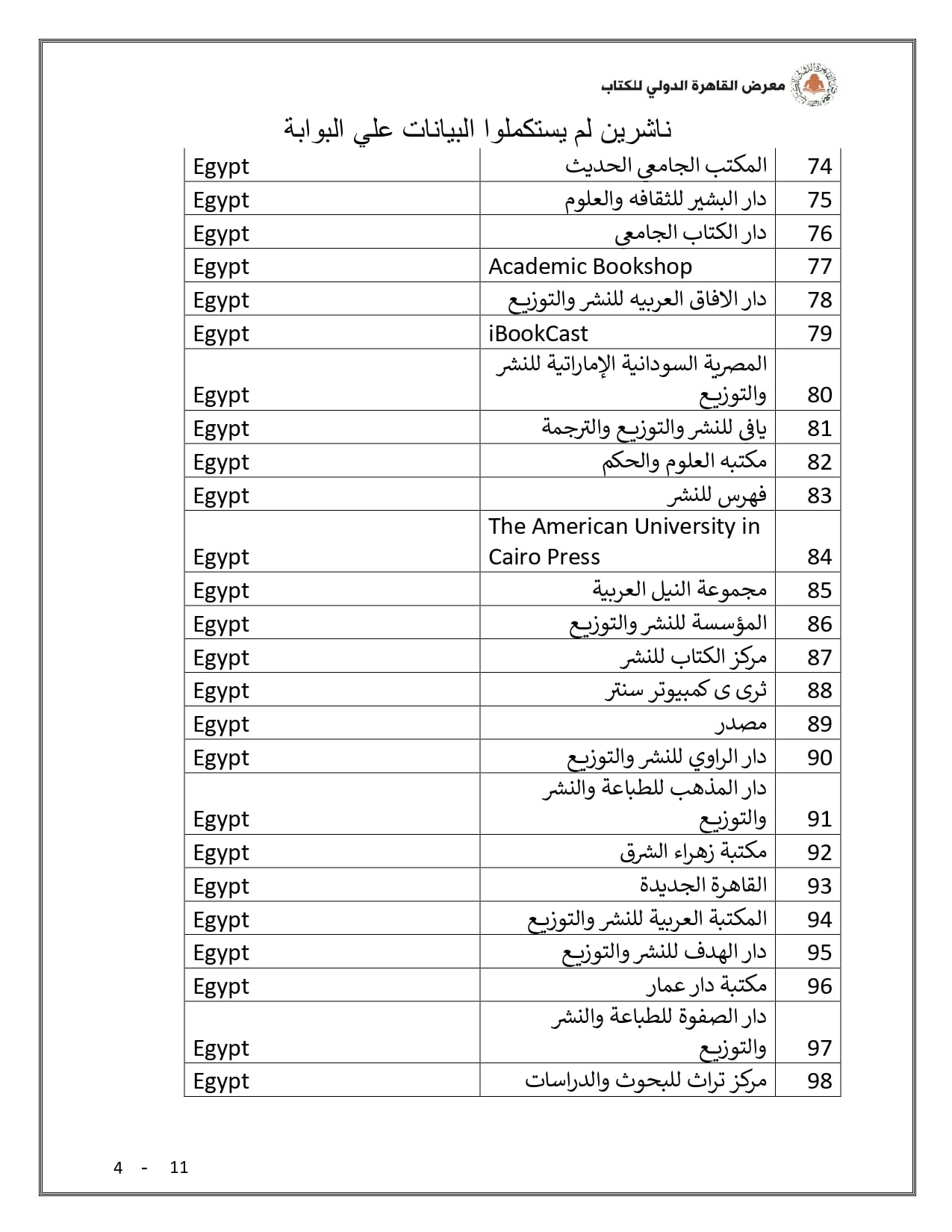 ونشر اتحاد الناشرين المصريين على صفحته الرسمية بموقع التواصل الاجتماعي "فيس بوك" كشوفًا بقائمتين الأولى تحتوي على الناشرين الذين قاموا بإنشاء حساب، ولكن لم يقوموا باستكمال بياناتهم بشكل صحيح، والقائمة الثانية تحتوي على الناشرين الذين قاموا بالانتهاء من الخطوة الثانية من تحميل المستندات وتسجيل البيانات، ولكن لم يبدؤوا في الخطوة الثالثة من تحميل إصداراتهم.