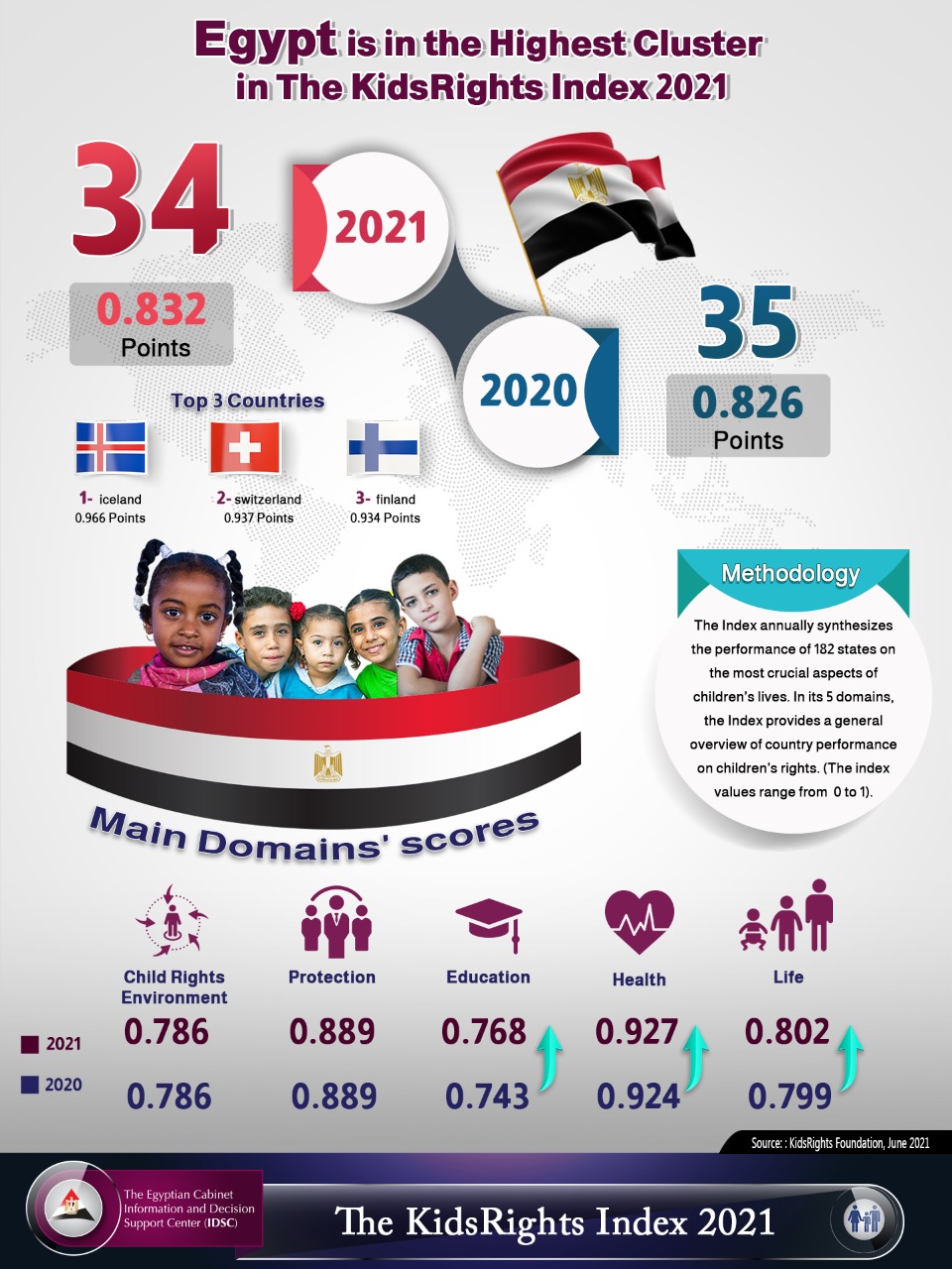 أصدر مركز المعلومات ودعم اتخاذ القرار بمجلس الوزراء المصري “إنفوجرافيك” جديدًا يرصد خلاله تقدم مصر في النسخة التاسعة من مؤشر حقوق الطفل 2021، الذي يصدر عن منظمة حقوق الطفل بالتعاون مع المعهد الدولي للدراسات الاجتماعية وجامعة إراسموس للاقتصاد بهولندا.
