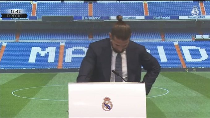 ويعقد راموس مؤتمرًا صحفيًا الآن رفقة فلورنتينو بيريز، رئيس نادي ريال مدريد، لتوديع جماهير الفريق عقب إعلان رحيله عن الملكي.